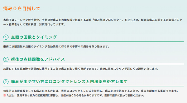 品川近視クリニックでは、手術中・手術後の痛みを可能な限り取り除く痛み解消プロジェクトを無料で用意!